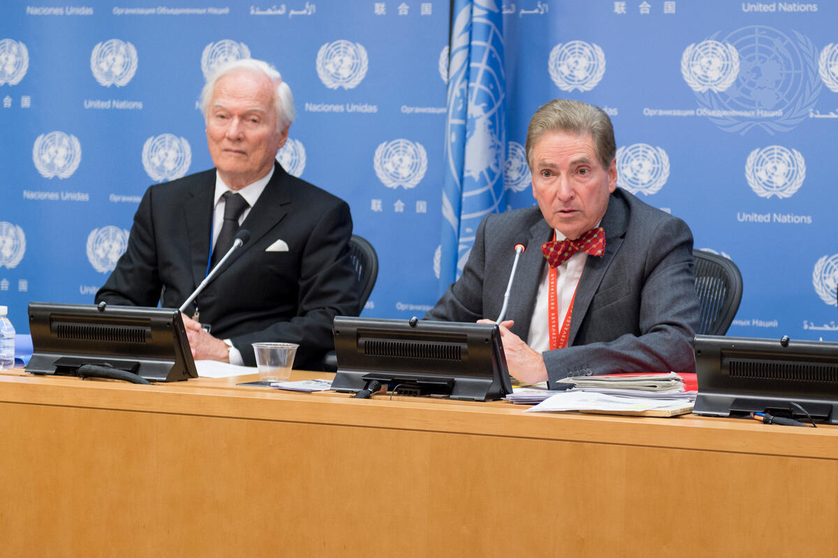 Alfred de Zayas (right), Independent Expert on the promotion of a democratic and equitable international order, briefs journalists. Idriss Jazairy (left), Special Rapporteur on Unilateral Coercive Measures, also briefed.