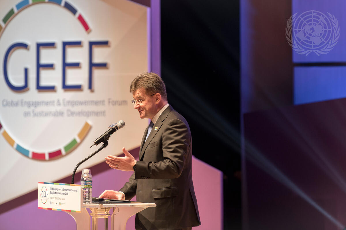 President of the seventy-second session of the UN General Assembly, makes remarks during the opening session of the first Global Engagement and Empowerment Forum on Sustainable Development (GEEF-SD). The Forum, held on the theme ""Putting People and Planet at the Centre"", was hosted by the Institute for Global Engagement and Empowerment (IGEE) and the Ban Ki-moon Centre for Global Citizens.