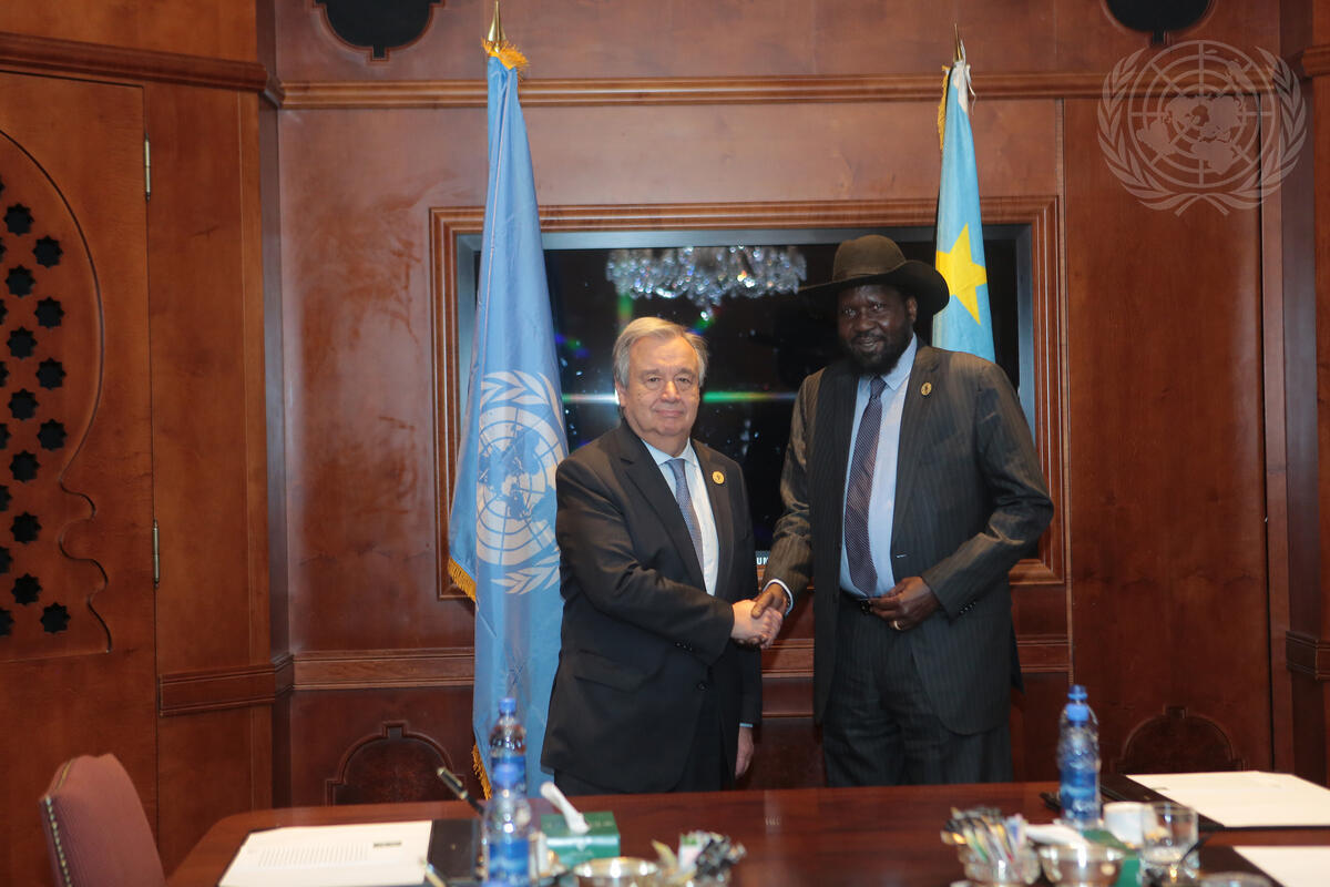 Secretary-General António Guterres (left) meets with Salva Kiir, President of the Republic of South Sudan, on the margins of the 30th African Union Summit.
