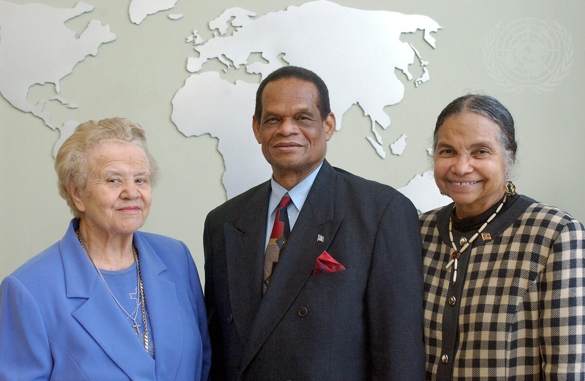 Julian R. Hunte (centre), President of the 58th session of the General Assembly meets with Erica-Irene Daes (left), Special Rapporteur of the Sub-Commission on Promotion and Protection of Human Rights , Commission of Human Rights. On the right is Ambassador Loemban Tobling-Klein, Special Advisor to the General Assembly President on Social, Humanitarian and Cultural affairs.