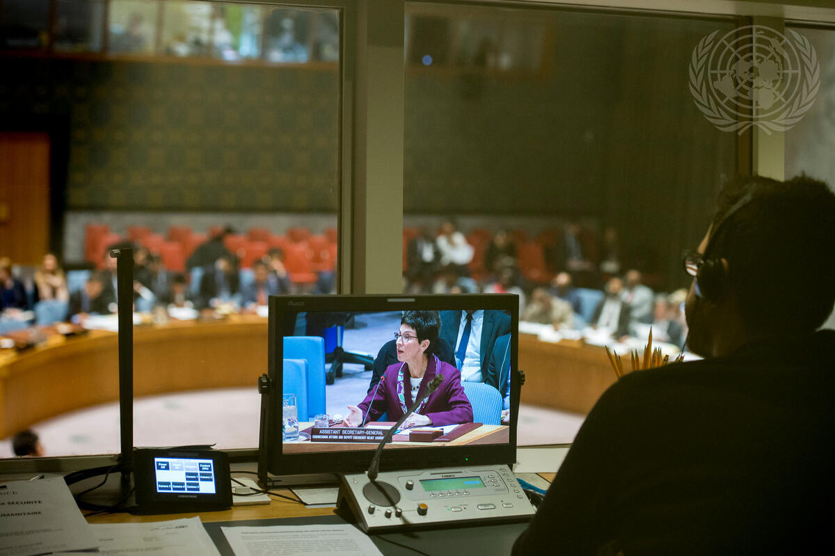 View from an interpretation booth as Ursula Mueller, Assistant Secretary-General for Humanitarian Affairs and Deputy Emergency Relief Coordinator in the Office for the Coordination of Humanitarian Affairs (OCHA), briefs the Security Council on the situation in the Middle East.