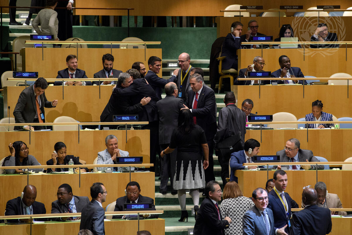The Brazilian delegation celebrates the outcome of the elections in the General Assembly Hall.