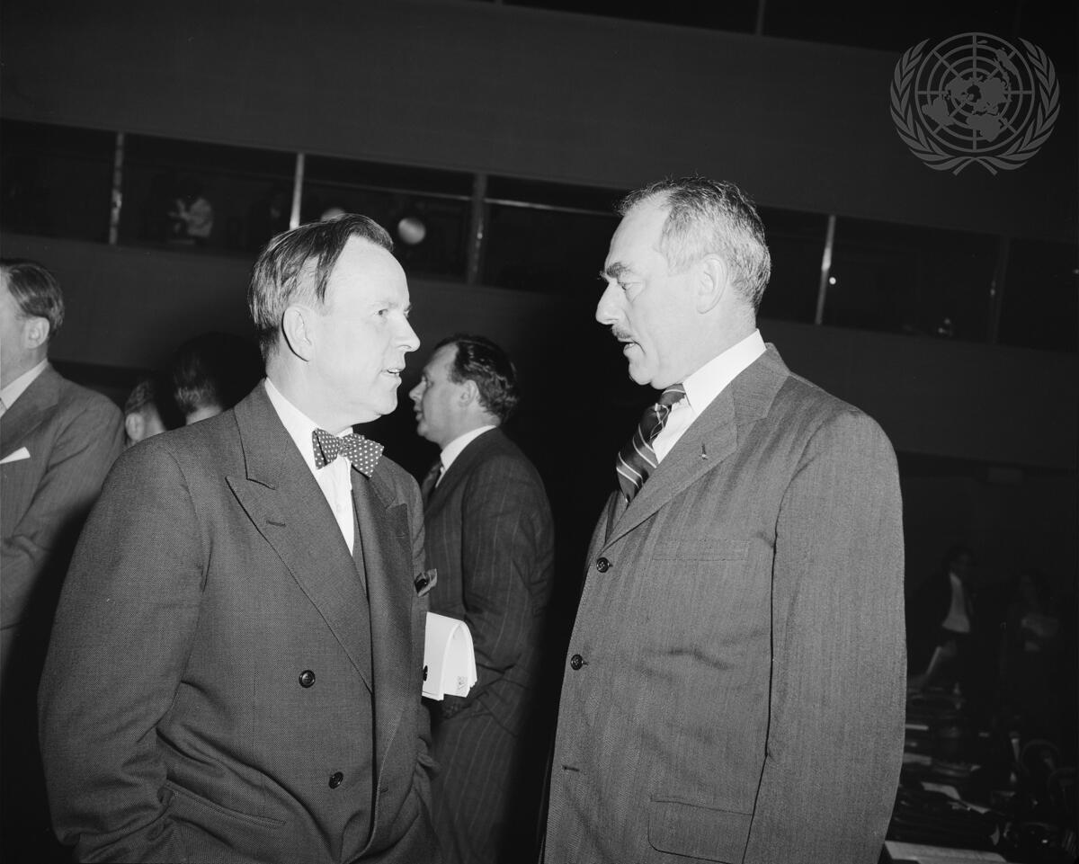 Mr. Lester Pearson, Canadian Secretary of State for External Affairs (left), chatting with Dean Acheson, Secretary of State of the United States (right). Both are Chairmen of their countries' delegations to the fifth session of the U.N. General Assembly.