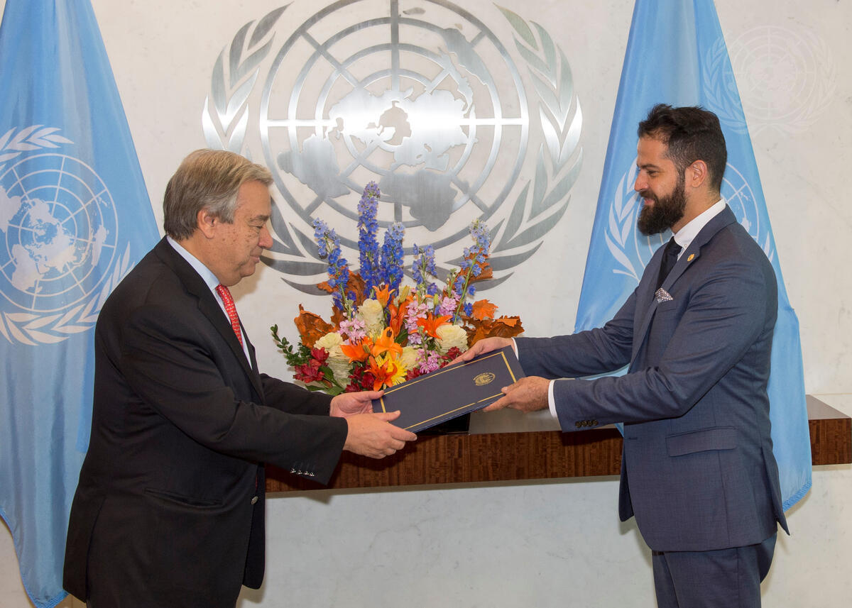 Rubén Armando Escalante Hasbún (right), new Permanent Representative of El Salvador to the United Nations, presents his credentials to Secretary-General António Guterres.