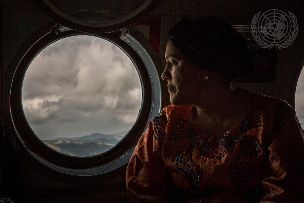 Deputy Secretary-General Amina Mohammed seen aboard a helicopter during a visit to Haiti to address the cholera situation and its resolution.