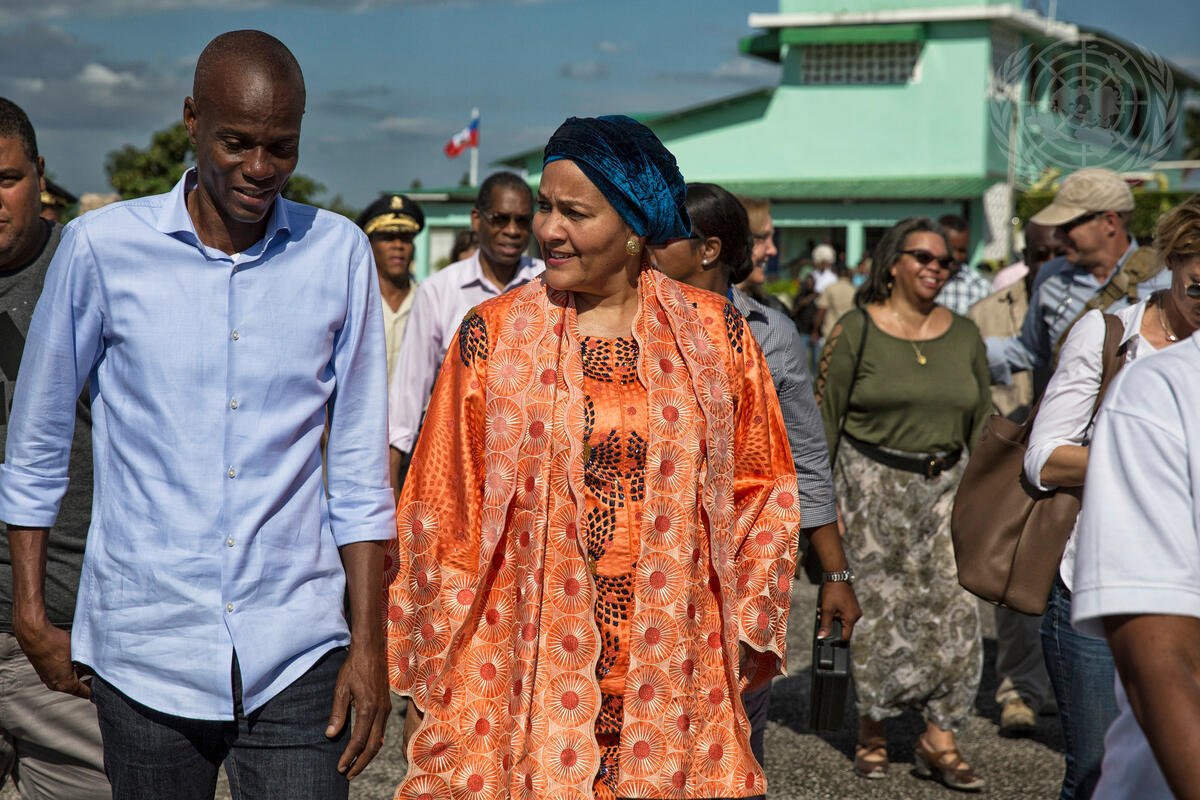 Deputy Secretary-General Amina Mohammed (centre) speaks with Jovenel Moïse (left), President of Haiti, before holding a joint press conference in Les Cayes. Ms. Mohamed was in Haiti on a three day visit to address the cholera situation and its resolution.
