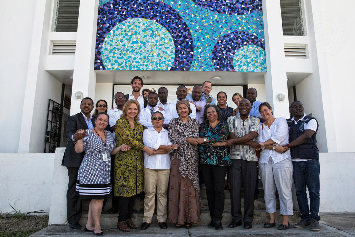 Deputy Secretary-General Amina Mohammed (centre), Josette Sheeran (third from right), Special Envoy for Haiti, Susan Page (fourth from right), Special Representative of the Secretary General and Head of the United Nations Mission for Justice Support in Haiti (MINUJUSTH), and Mamadou Diallo (far left), Deputy Special Representative of the Secretary General, pose for a group photo with staff and students of the Hôpital Universitaire in Mirebalais during a three day visit to Haiti to address the Cholera situation and its resolution.