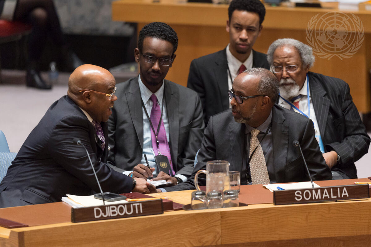 Mohamed Siad Doualeh (left), Permanent Representative of the Republic of Djibouti to the UN, greets Abukar Dahir Osman, Permanent Representative of the Federal Republic of Somalia, at the Security Council meeting on the situation in Eritrea and in Somalia.