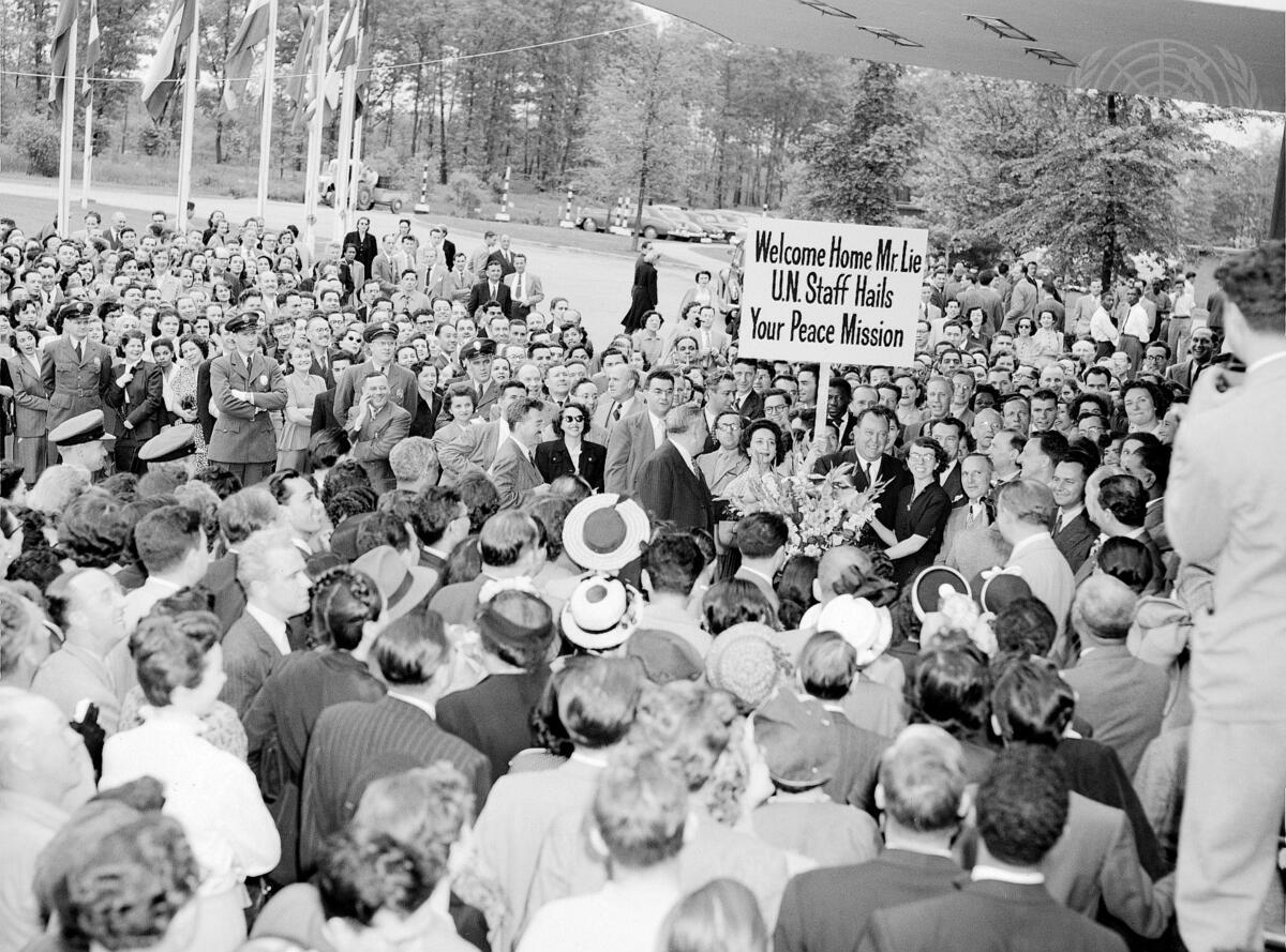Secretariat staff at UN headquarters welcome Trygve Lie, Secretary-General of the United Nations, upon his return from a United Nations Peace mission. Lake Success, New York 25 May 1950.