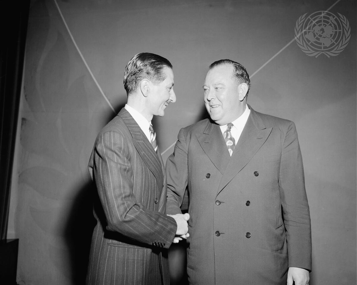"Trygve Lie, Secretary-General of the United Nations (right), chatting with Ambassador Nasrollah Entezam (Iran), Permanent Representative of Iran to the United Nations