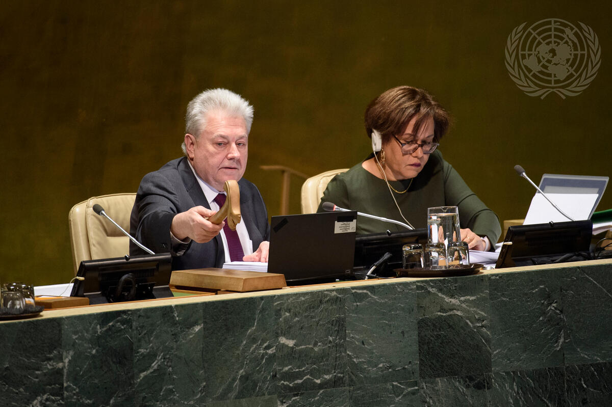 Volodymyr Yelchenko (left), Vice-President of the seventy-third session of the General Assembly and Permanent Representative of Ukraine to the UN, chairs the General Assembly meeting that hears reports on the First Committee (Disarmament and International Security). The Assembly voted on a number of resolutions, related to general and complete disarmament. At right is Ruth de Miranda, Director of the General Assembly and Economic and Social Council (ECOSOC) Affairs Division of the Department of General Assembly and Conference Management (DGACM).