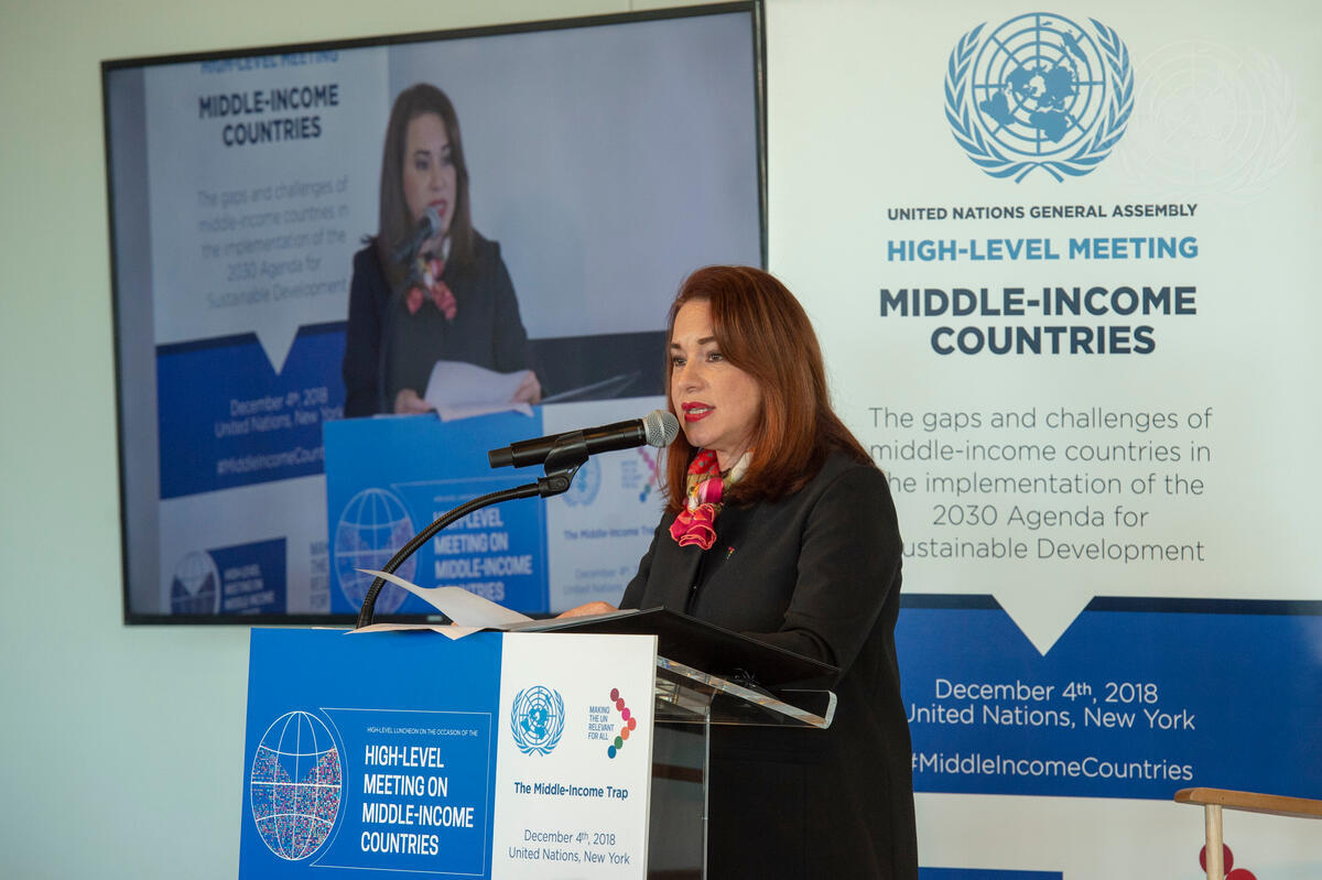 María Fernanda Espinosa Garcés, President of the seventy-third session of the General Assembly, addresses the high-level meeting discussing the gaps and challenges of middle-income countries in the implementation of the 2030 Agenda for Sustainable Development.