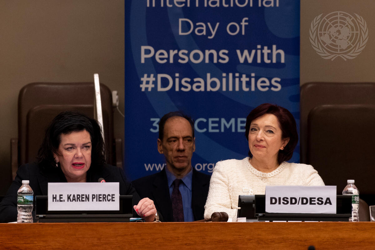Karen Pierce (left), Permanent Representative of the United Kingdom to the UN, addresses the special event titled ""Empowering Persons with Disabilities and Ensuring Inclusiveness and Equality"" on the occasion of the International Day of Persons with Disabilities. At right is Daniela Bas, Director of the UN Department of Economic and Social Affairs (DESA) Division for Social Policy and Development.
