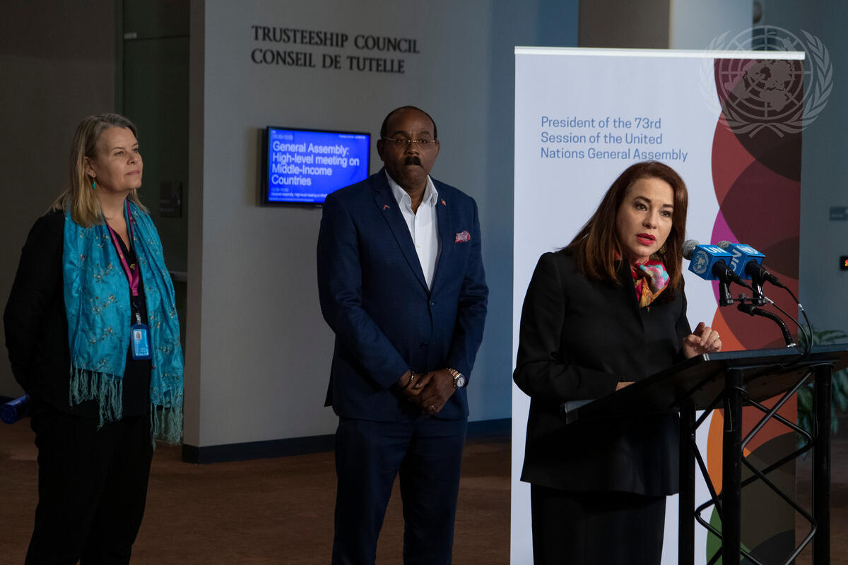 María Fernanda Espinosa Garcés (at podium), President of the seventy-third session of the General Assembly, briefs press on the launch of the Global Campaign against Plastic Pollution and single-use of plastic. Behind her are Mari Skåre (left), Deputy Permanent Representative of Norway, and Gaston Browne, Prime Minister of Antigua and Barbuda. The campaign focuses on reducing single-use plastic within the UN as well as a global advocacy campaign against single-use plastic more generally.
