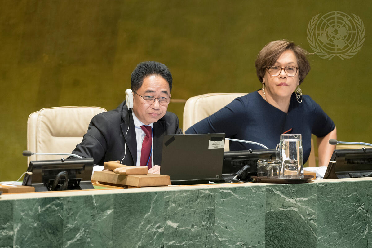Savann Ke (left), Vice-President of the seventy-third session of the General Assembly and Permanent Representative of the Kingdom of Cambodia to the UN, chairs the General Assembly meeting on sport for development and peace. At right is Ruth de Miranda, Director of the General Assembly and Economic and Social Council (ECOSOC) Affairs Division of the Department of General Assembly and Conference Management (DGACM).