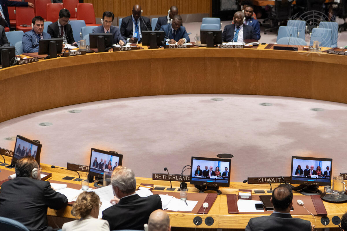 Staffan de Mistura (on screens), UN Special Envoy for Syria, briefs the Security Council on the situation in the Middle East.