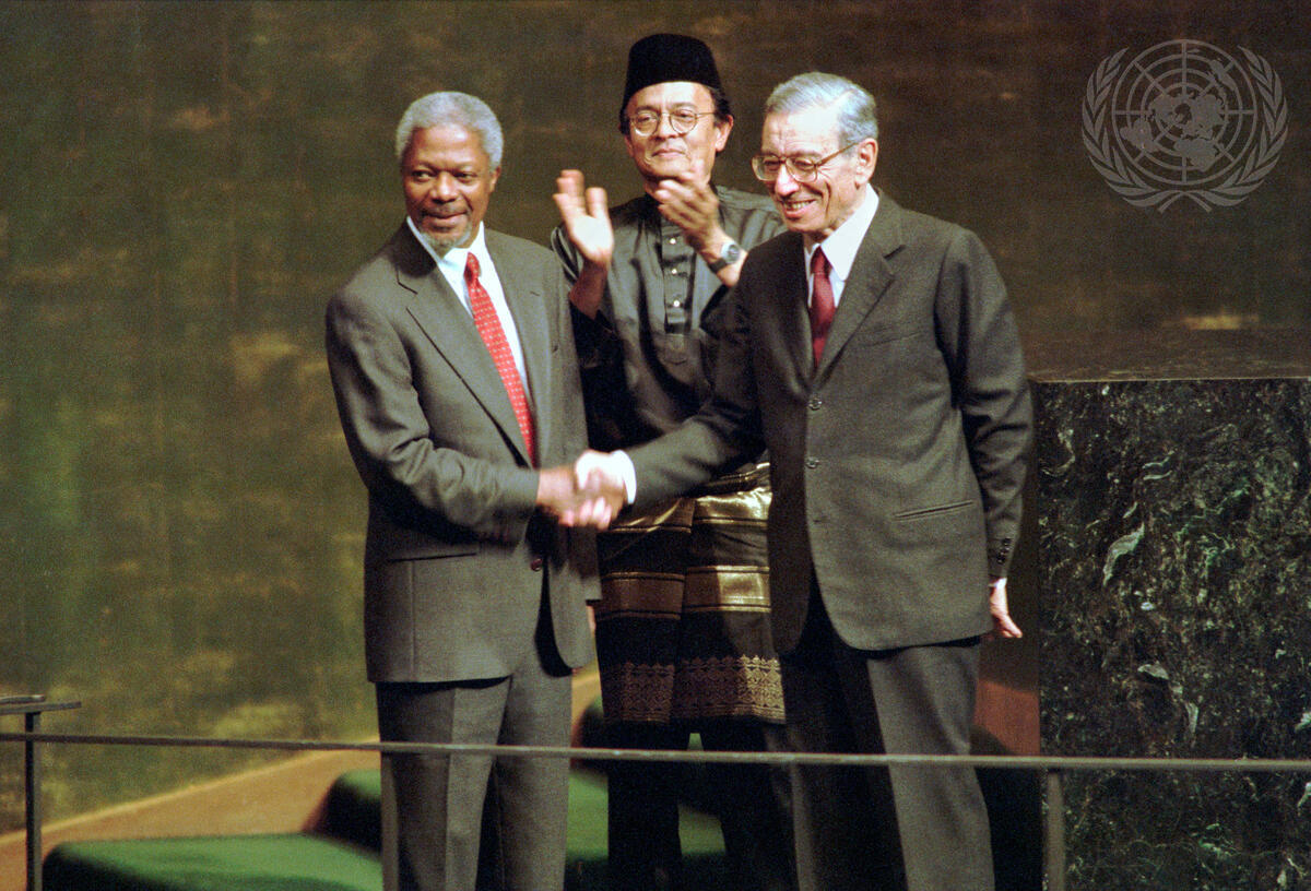Boutros Boutros-Ghali, Secretary-General of the UN, welcomes Kofi Annan, the seventh Secretary-General of the United Nations, to the podium of the General Assembly Hall. Razali Ismail Malaysia, President of the fifty-first General Assembly is standing in the centre.