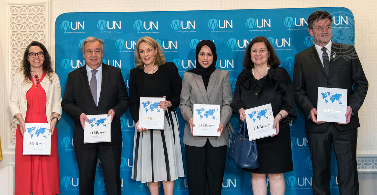 From left to right: Ana Maria Menéndez, Senior Adviser on Policy; Secretary-General António Guterres; Ms Mejía Vélez; Ms Saif Al-Thani; Maria Luiza Ribeiro Viotti, Chef de Cabinet; Miroslav Lajcák, President of the seventy-second session of the General Assembly.