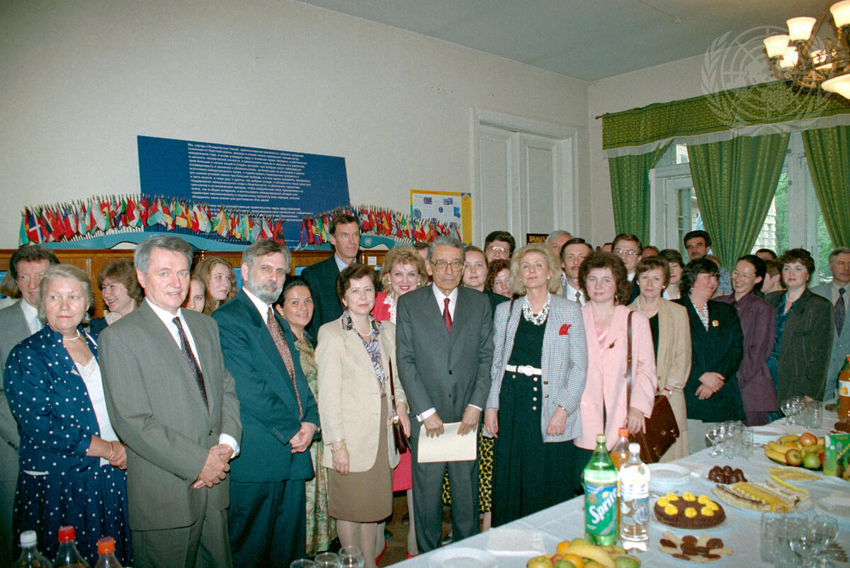 On his official visit to Russia, Secretary-General Boutros Boutros-Ghali (centre, holding folder) meets with the staff of the United Nations Information Centre (UNIC) in Moscow. Samir Al-Jijakli, Director of the United Nations Information Centre in Moscow, is third from left.