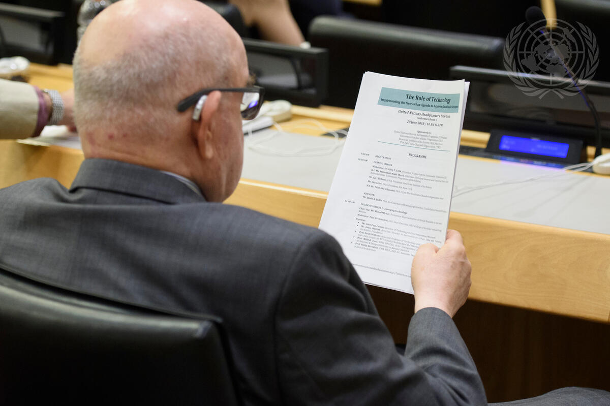 A participant is reading the programme of the special event entitled ""The Role of Technology: Implementing the New Urban Agenda to Achieve Sustainable Development"".