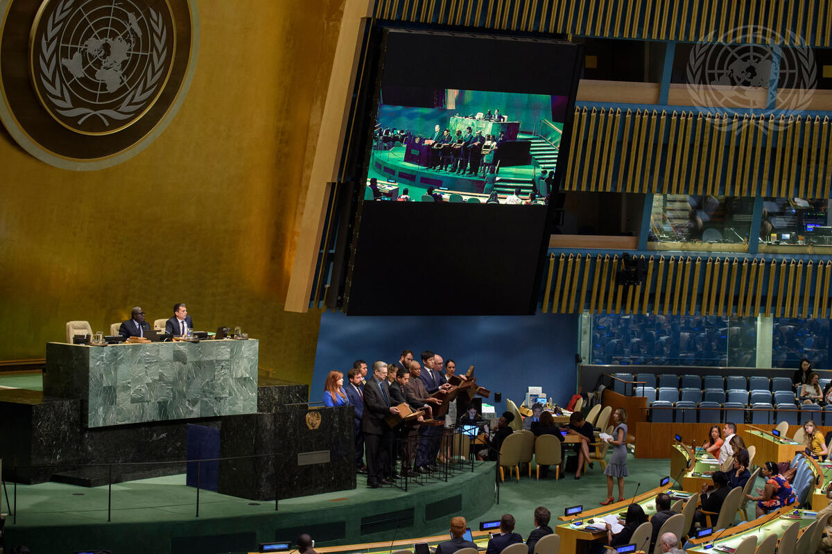 Conference officers hold up empty ballot boxes for inspection by designated teller delegates, in advance of collecting member states' ballots in the General Assembly.