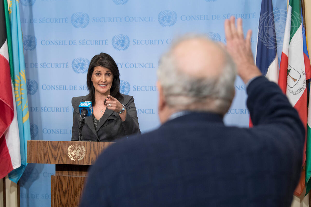 Nikki R. Haley (at podium), Permanent Representative of the United States to the UN, speaks to journalists about developments on the Korean Peninsula and in Iran.