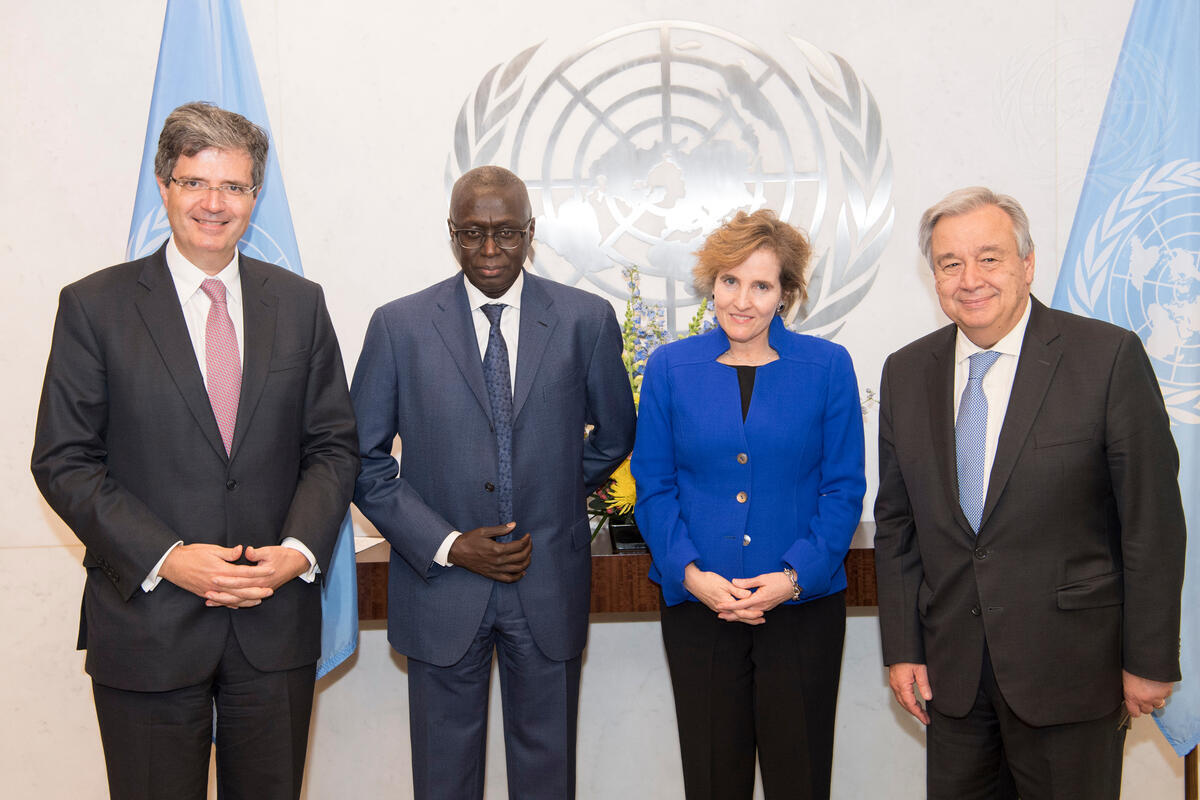 Secretary-General António Guterres (right) meets with Alice Albright (centre right), Chief Executive Officer of the Global Partnership for Education, along with Fodé Seck (centre left), Permanent Representative of Senegal to the UN, and François Delattre, Permanent Representative of France.