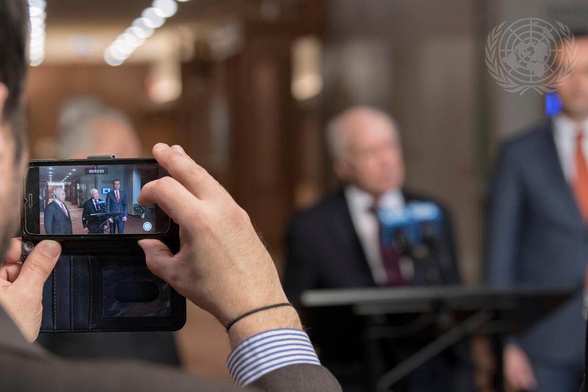 Matthew Nimetz (centre), Personal Envoy of the Secretary-General for the talks between Greece and the former Yugoslav Republic of Macedonia, speaks to journalists on the status of discussions on the “name” issue between the two nations.