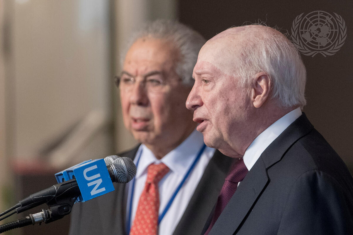 Matthew Nimetz (right), Personal Envoy of the Secretary-General for the talks between Greece and the former Yugoslav Republic of Macedonia, speaks to journalists on the status of discussions on the “name” issue between the two nations.