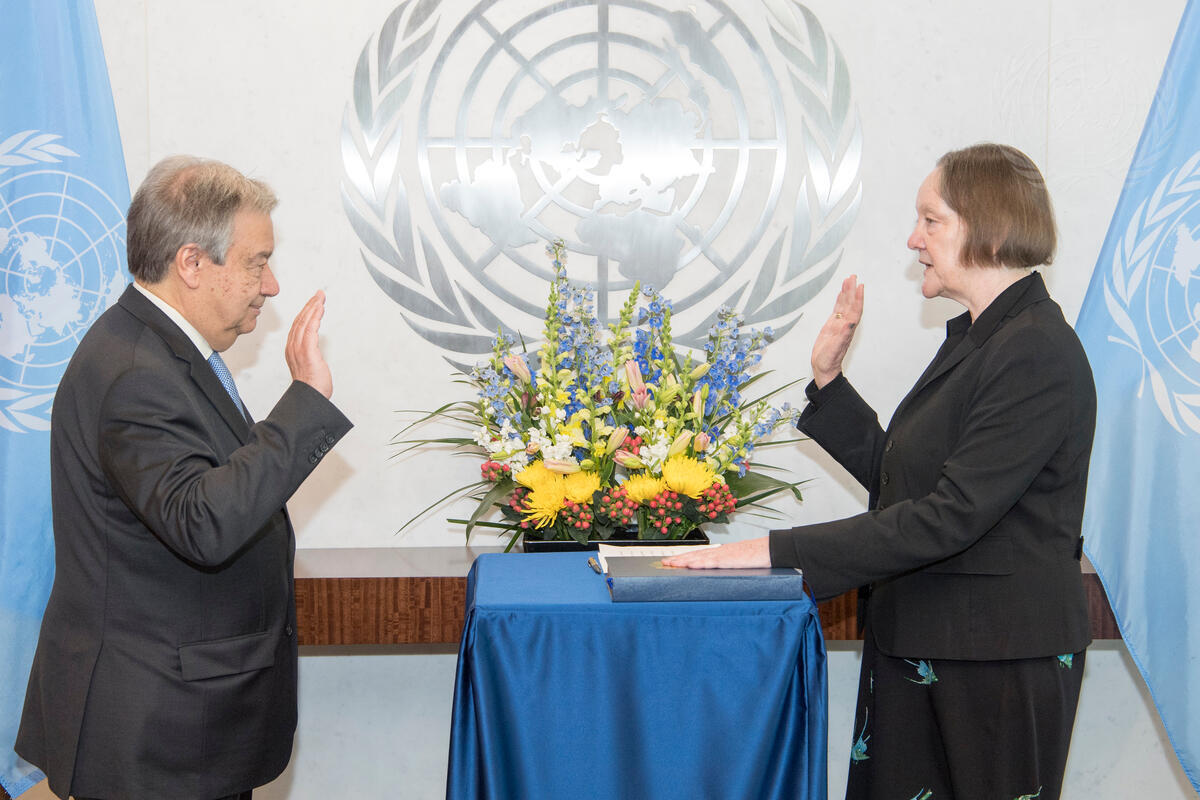 Secretary-General António Guterres (left) swears in Jane Connors, Victims’ Rights Advocate for the United Nations.
