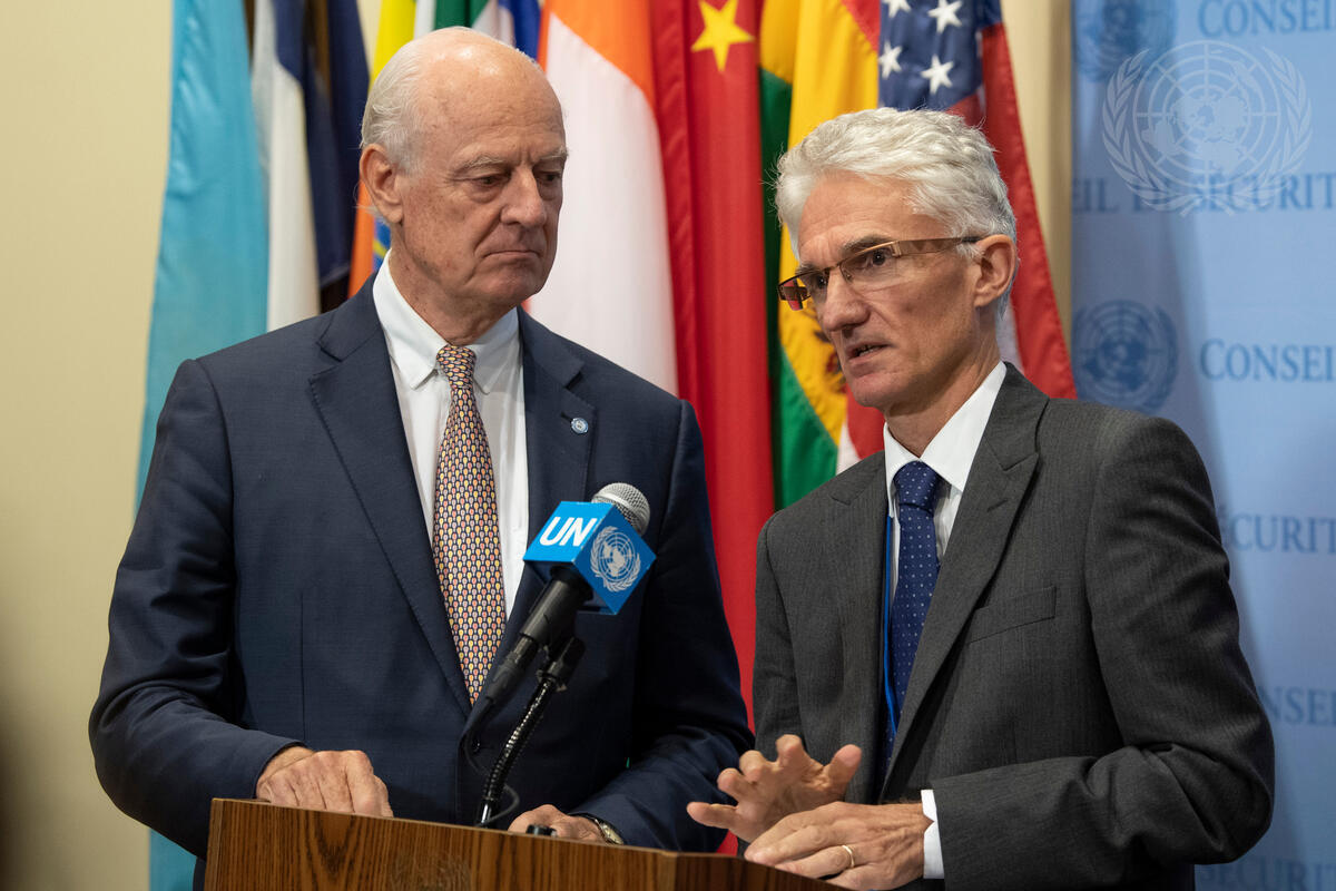 Mark Lowcock (left), Under-Secretary-General for Humanitarian Affairs and Emergency Relief Coordinator, and Staffan de Mistura, UN Special Envoy for Syria, brief journalists after the Security Council meeting on the situation in the Middle East.