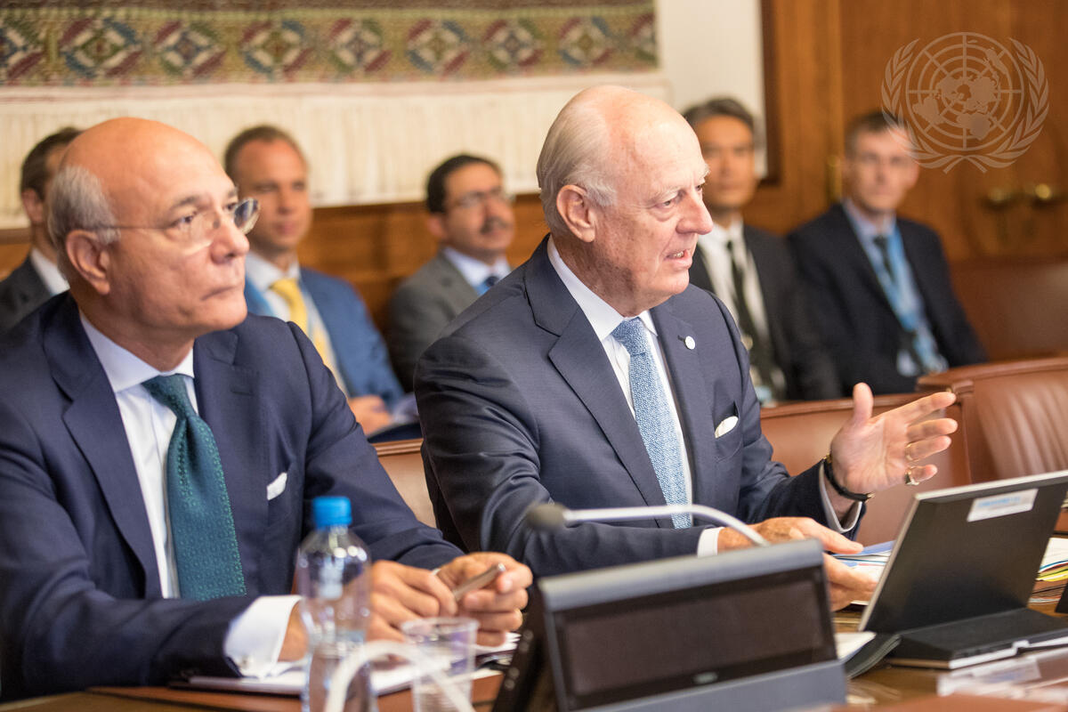 Staffan de Mistura (right), UN Special Envoy for Syria, addresses the consultations on Syria in Geneva.