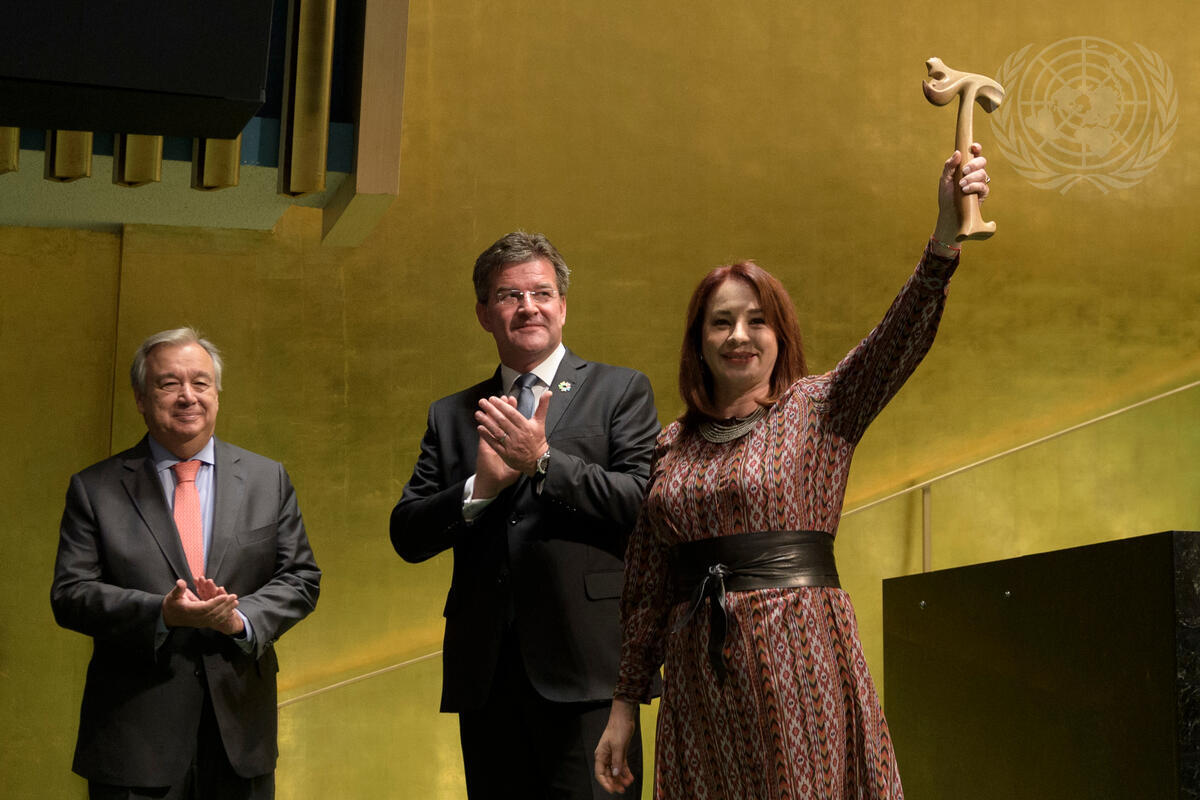 María Fernanda Espinosa Garcés (right), President of the seventy-third session of the General Assembly, holds the gavel after the handover from Miroslav Lajcák (centre), President of the seventy-second session of the General Assembly. At left is Secretary-General António Guterres.