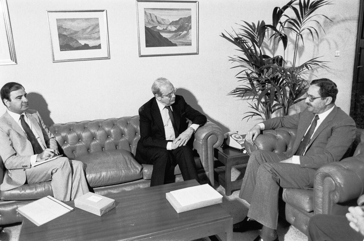 At the invitation of the Governments of Egypt, Israel, Jordan, Lebanon and Syria, Javier Perez de Cuellar, Secretary-General of the United Nations, pays officials visits to those countries. Photo shows the Secretary-General (centre), meeting with Ahmad Obeidat (right) and Foreign Minister Taher al Masri (left).