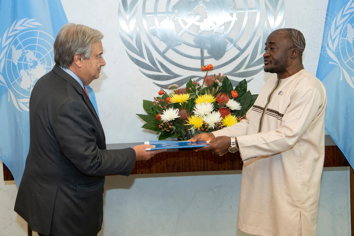 Dee-Maxwell Saah Kemayah (right), new Permanent Representative of the Republic of Liberia to the United Nations, presents his credentials to Secretary-General António Guterres.