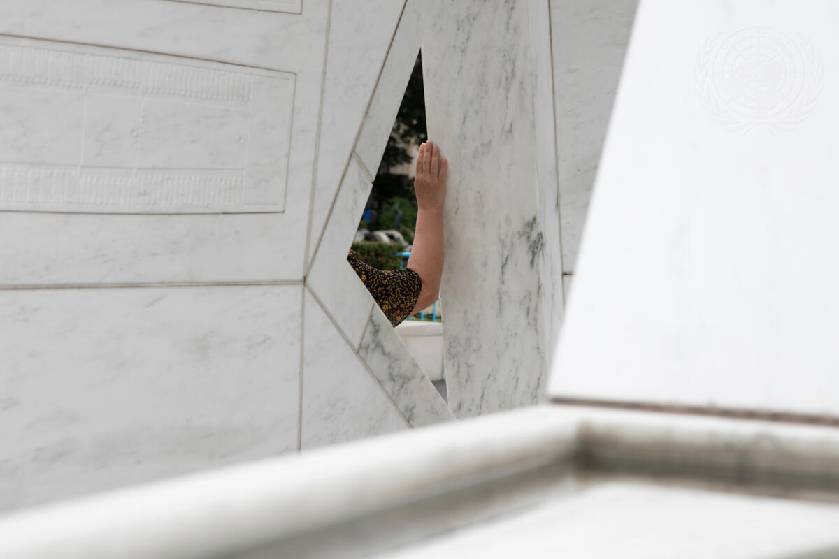 A tourist poses at the memorial to honor the victims of slavery and the transatlantic slave trade in the Visitors Plaza at UN Headquarters in New York.