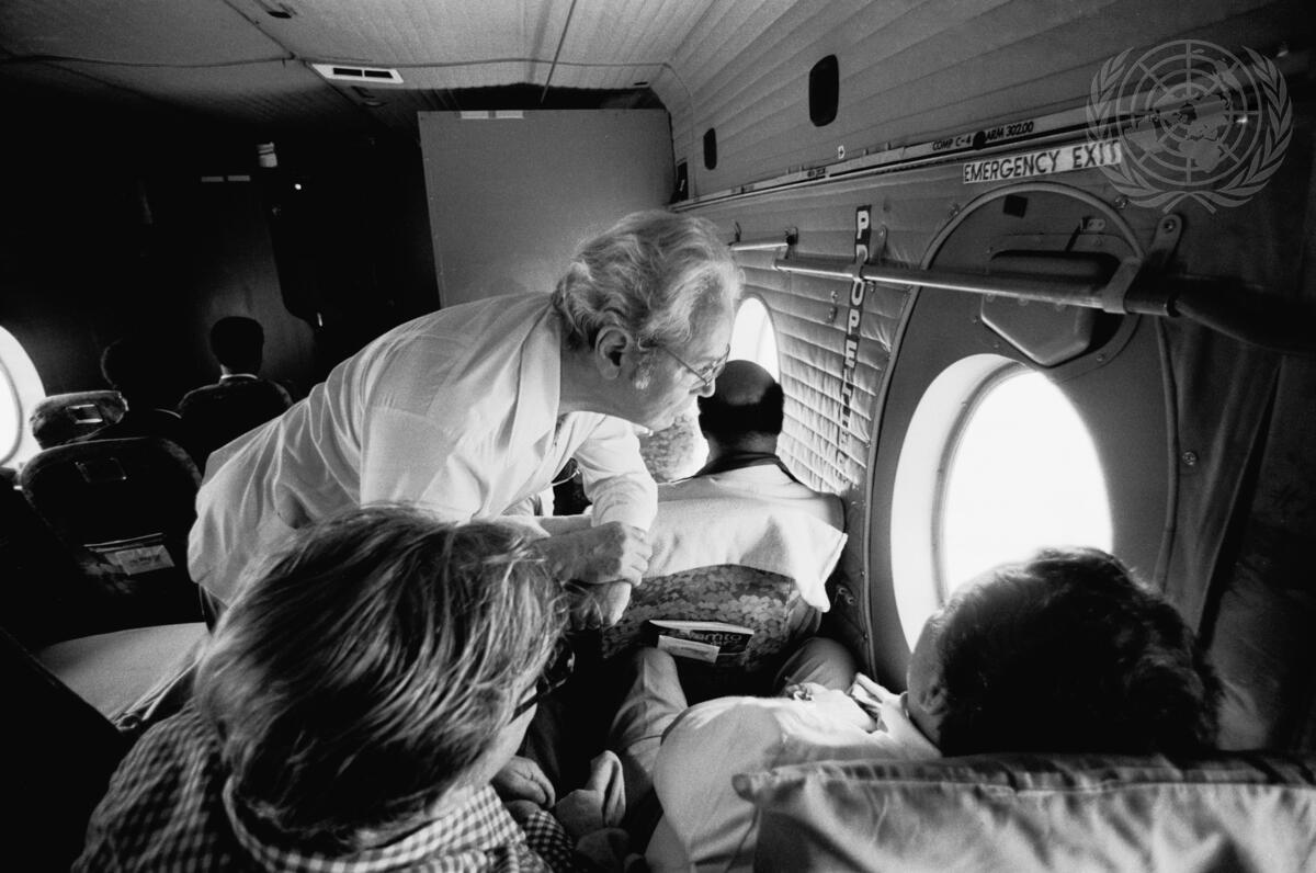 Secretary-General Javier Perez de Cuellar (center) en route by plane to Alamata from where he was driven to Korem which is at the center of one of the areas worst-affected by the drought.