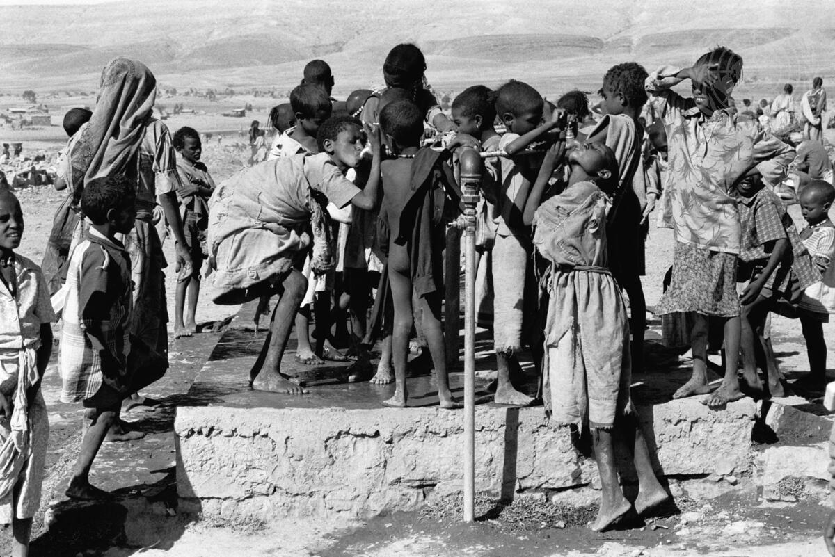Javier Perez de Cuellar, Secretary-General of the United Nations, visits drought-stricken areas in Ethiopia. Photo shows youngster crowding around the water taps at a camp of famine victims in Makalle, northern Ethiopia.