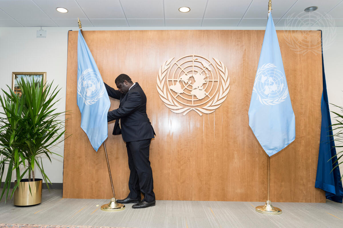 A UN Protocol and Liaison Service staff member prepares a conference room for bilateral meetings between Secretary-General's António Guterres and others, in the lead-up to the annual general debate of the General Assembly.