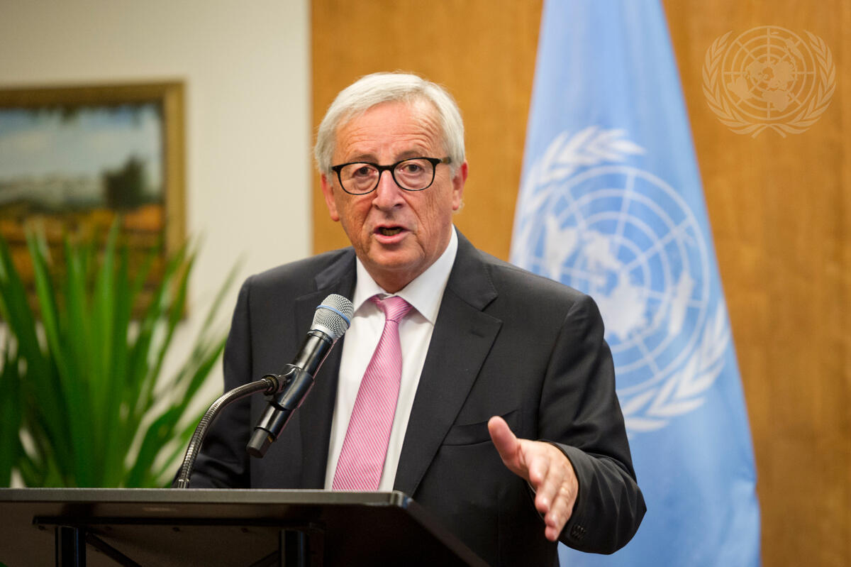 Jean-Claude Juncker, President of the European Commission, briefs press alongside Secretary-General António Guterres (not pictured).