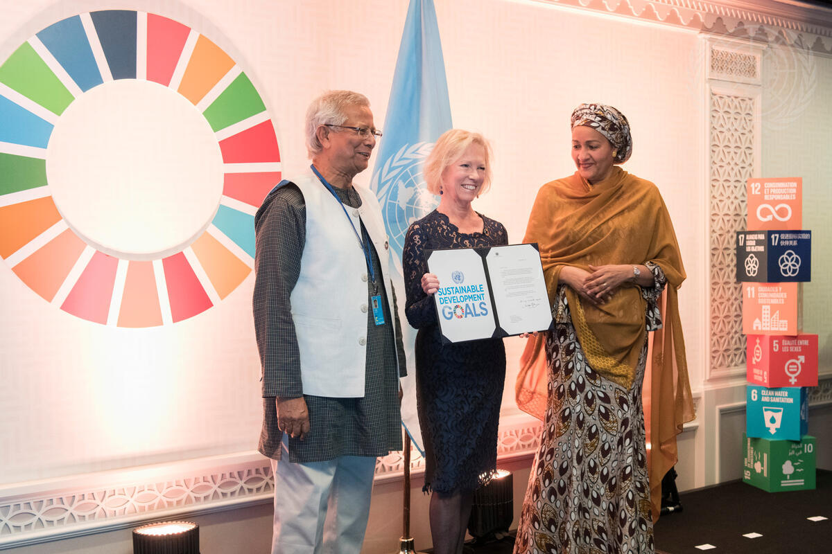 Ms. Calvin is flanked by Muhammad Yunus, Founder of Grameen Bank, and Deputy Secretary-General Amina Mohammed.