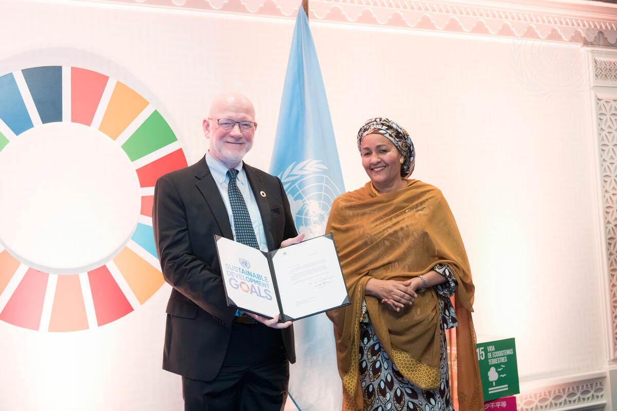 Chris Elias (left), President of the Global Development Division of the Bill and Melinda Gates Foundaiton, holds up a letter written to Bill and Melinda Gates by Secretary-General António Guterres, thanking them for contributions made by the Foundation toward the success of rhe 2030 Agenda for Sustainable Development and the Sustainable Development Goals.