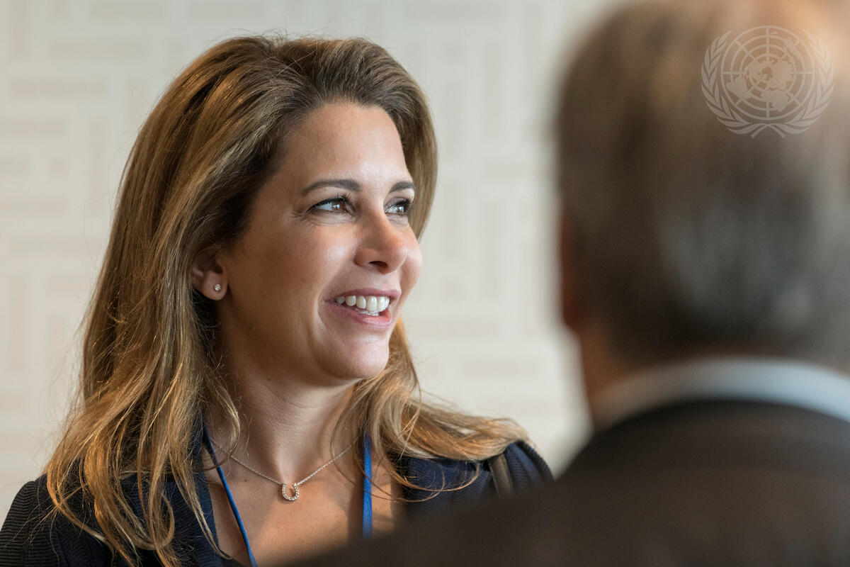 Secretary-General António Guterres (back to camera) speaks with UN Messengers of Peace Princess Haya Bint Al Hussein of Jordan (left) and actor Michael Douglas (not pictured) prior to the annual Peace Bell ceremony held at UN headquarters in observance of the International Day of Peace (21 September).