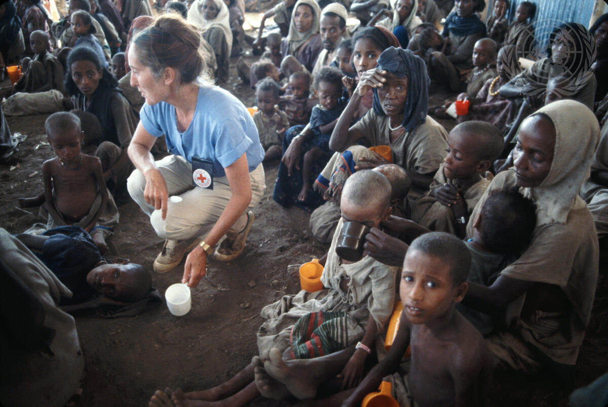 A young British Red Cross worker assists drought victims at a camp in Bati, Ethiopia.