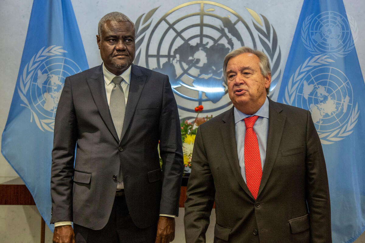 Secretary-General António Guterres (right) and Moussa Faki Mahamat, Chairperson of the African Union Commission, jointly address the media.
