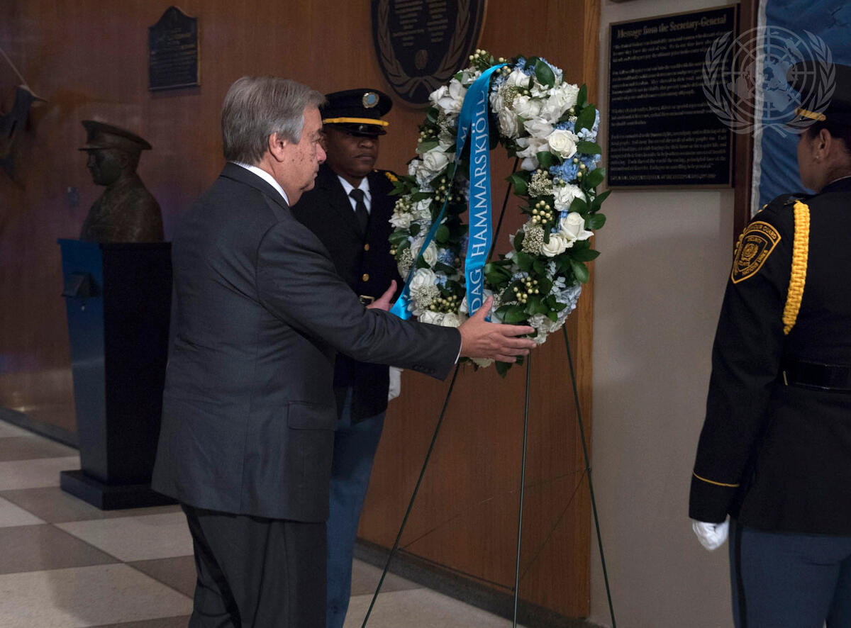 Secretary-General António Guterres lays a wreath in commemoration of the 57th anniversary of the death of former Secretary-General Dag Hammarskjöld.