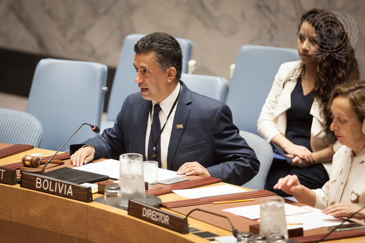 Sacha Sergio Llorentty Solíz, Permanent Representative of Bolivia to the UN and Security Council President for the month of October, chairs the Security Council meeting on the situation in Colombia.