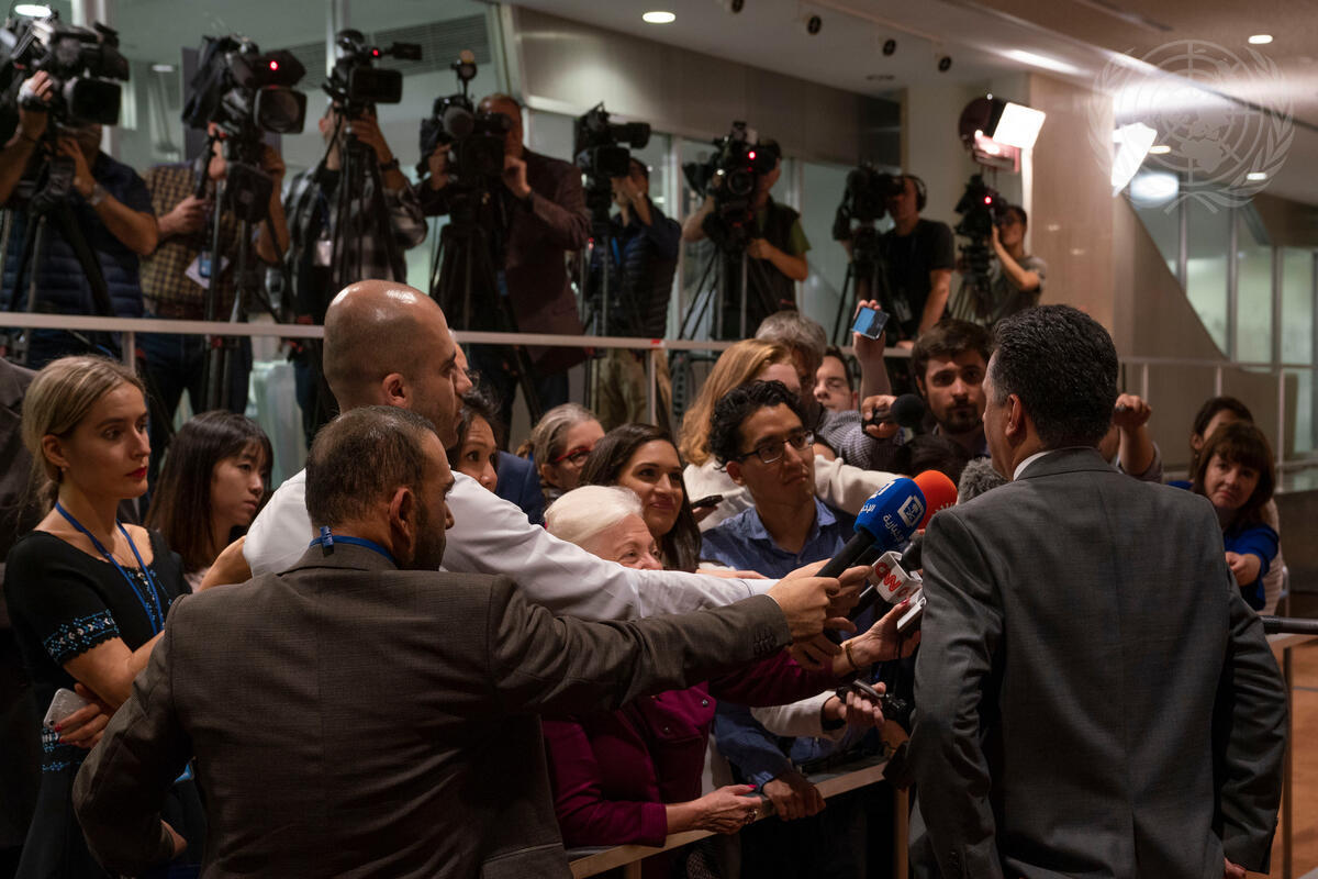 Sacha Sergio Llorentty Solíz (at right, back to camerta), Permanent Representative of Bolivia to the UN and Security Council President for the month of October, speaks to press after Security Council consultations on the Middle East (Syria).