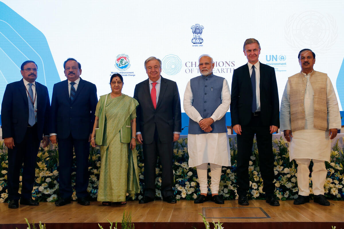 Caption Description Secretary-General António Guterres (centre) honours Narendra Modi (third from right), Prime Minister of the Republic of India, with the Champion of Earth award, the highest environmental honour of the United Nations.
