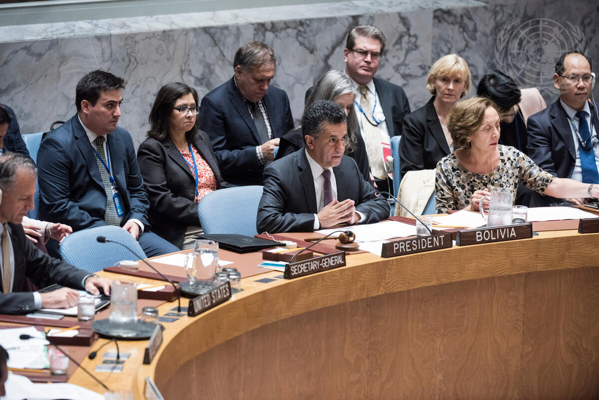 Sacha Sergio Llorentty Solíz (centre), Chair of the 1540 Committee, Permanent Representative of Bolivia to the United Nations and Security Council President for the month of October, briefs the Security Council meeting on the work of the 1540 Committee, and delivers a joint statement on behalf of the Committees established pursuant to resolutions 1267, 1989 and 2253, 1373 and 1540.